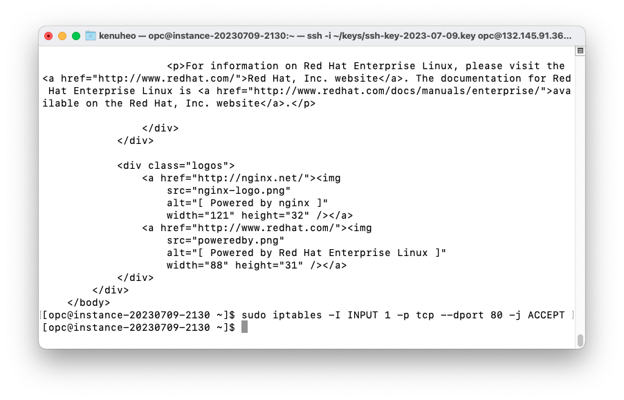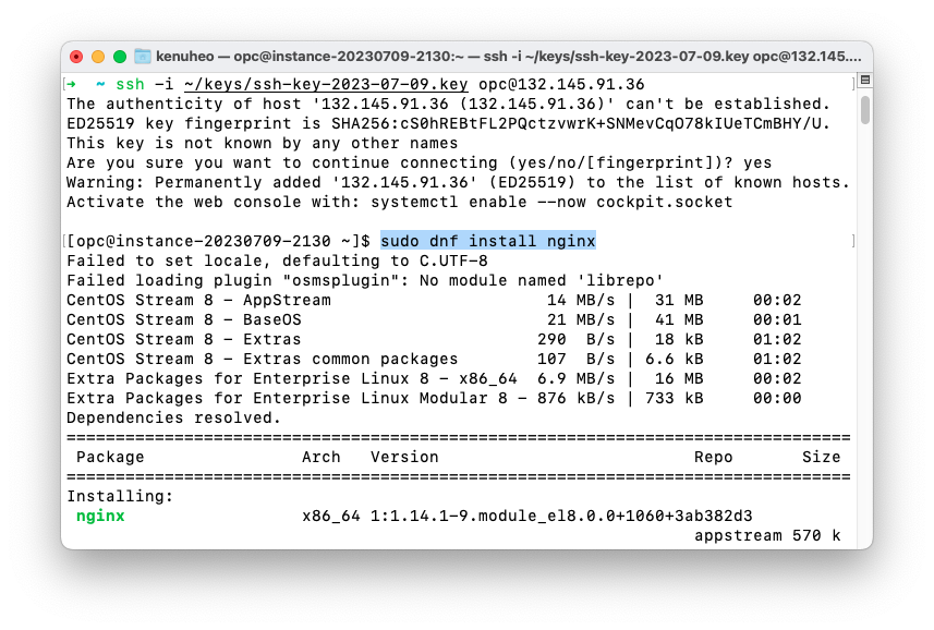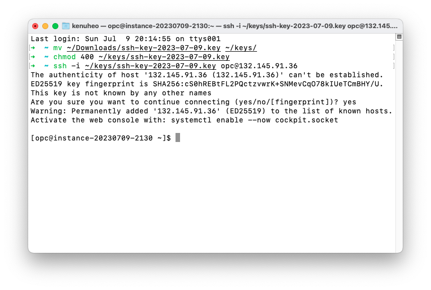 터미널에서 `ssh -i ~/keys/ssh-key-2023-07-09.key opc@132.145.91.36` 명령으로 접속할 수 있습니다. fingerprint 저장은 `yes` 라고 답합니다. 윈도우의 경우 Git Bash창에서 같은 명령을 사용할 수 있습니다. 우분투 이미지는 opc@ 대신 ubuntu@ 아이디로 접속할 수 있습니다.