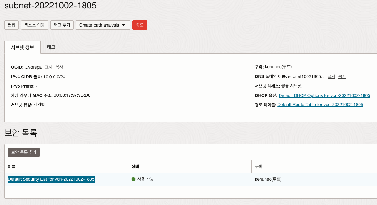 보안 목록에 `Default Security List*`를 선택합니다.